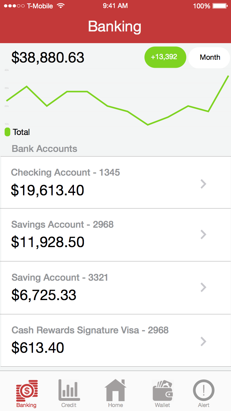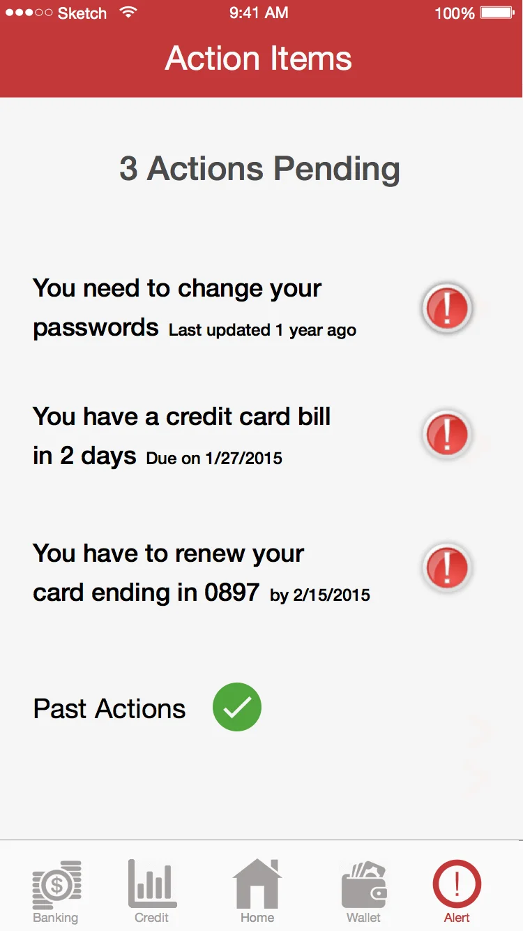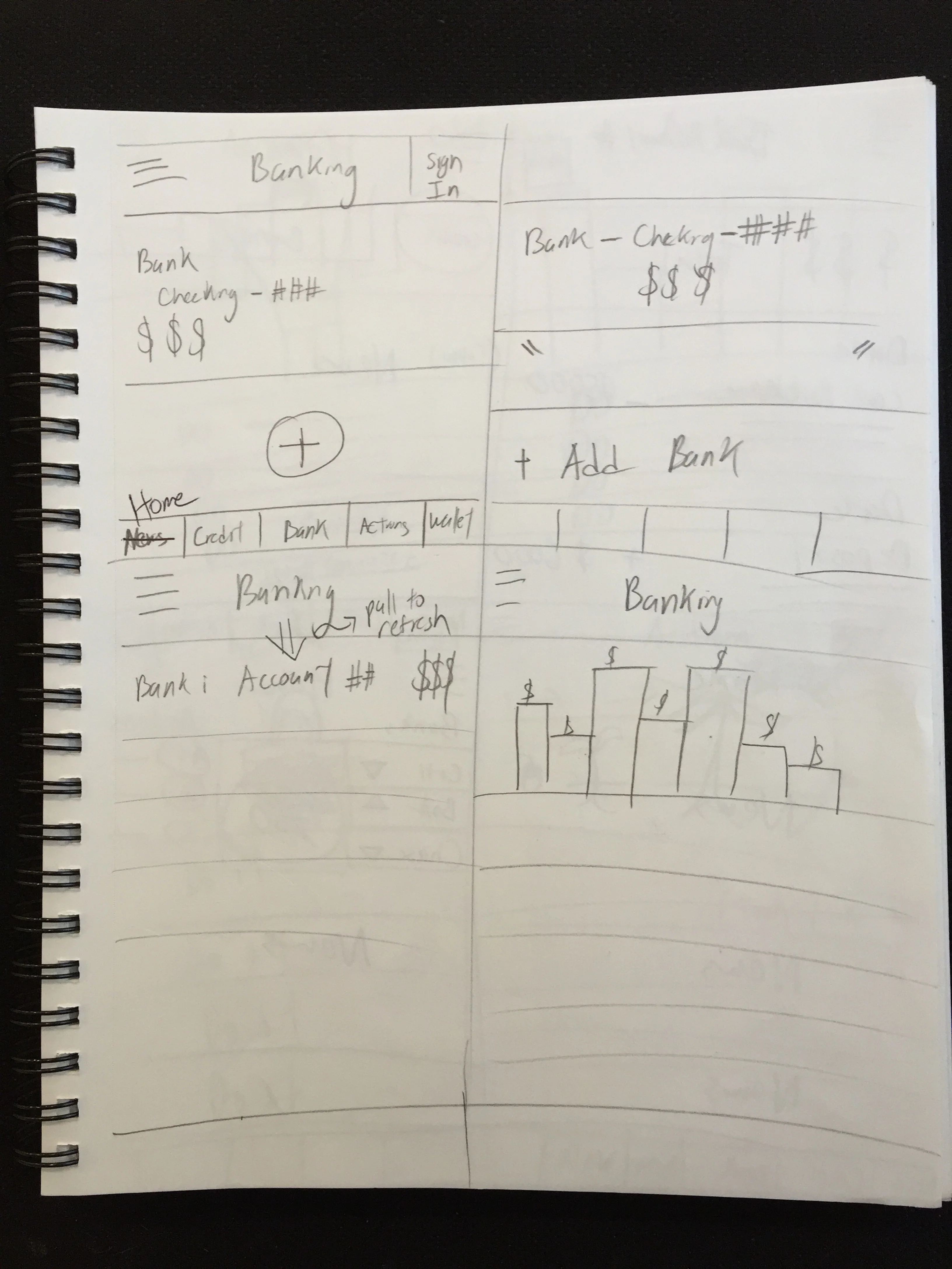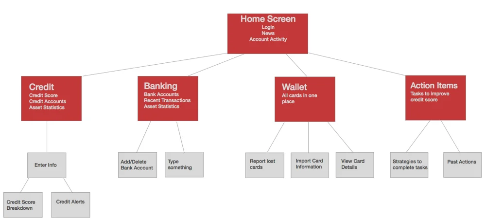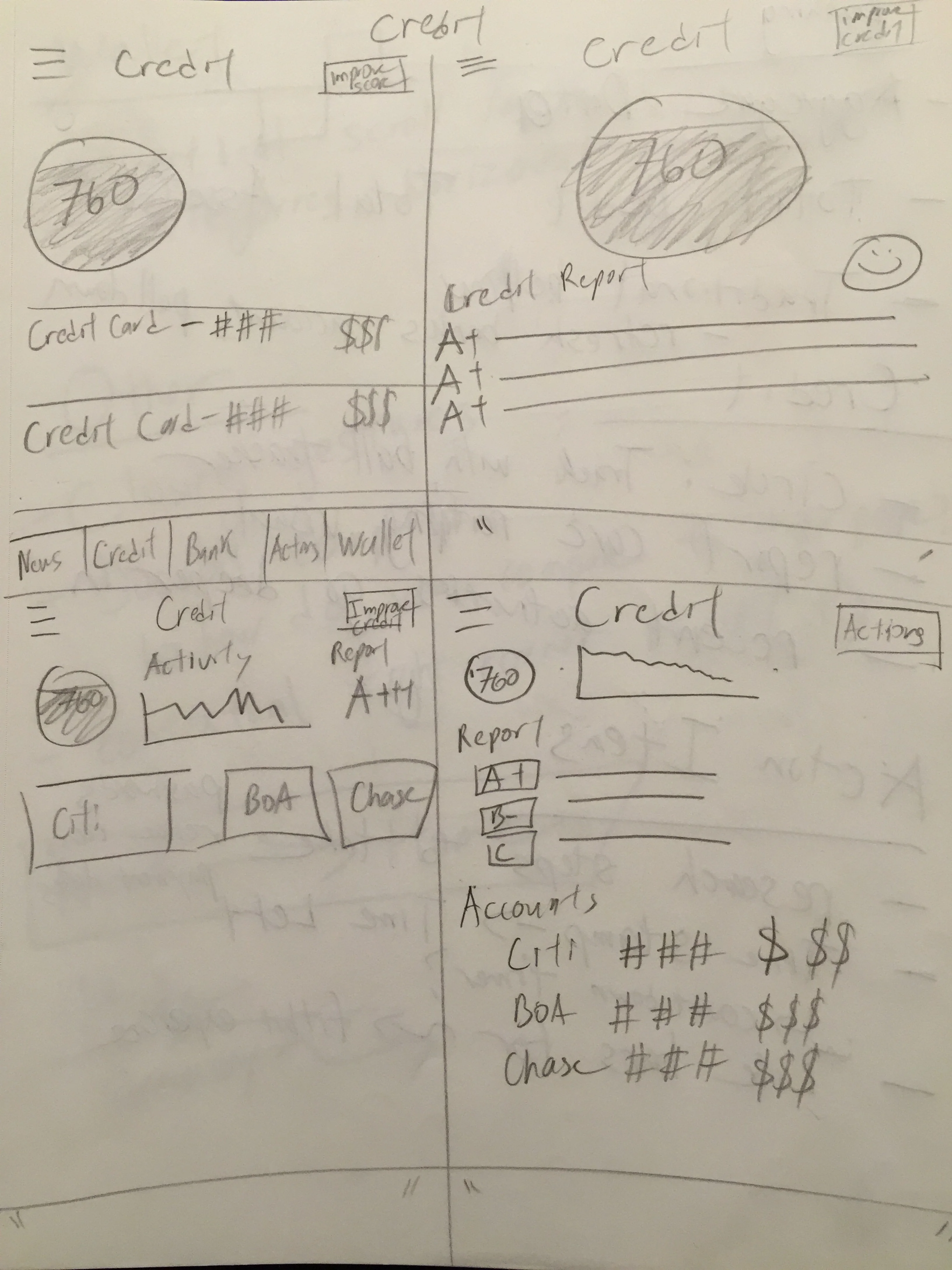 As a team, we draw out wireframes each feature such as banking, credit, wallet, action items, and the home screen. We made sure for banking that users can see all of their checking and savings accounts in one place, between multiple banks. In credit, we wanted to ensure users can see their current credit score, get explanations on why they have the score they do and learn how they can improve it. In the wallet, we made sure that users can save their personal identification cards like driver’s license in case it’s ever lost. For action items, users can get notifications that they act on with a suggestion on how to complete this action.